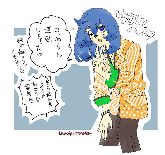 派手な格好もいけるやろと思って着せたら芸人みたいになってウケています。胸はいつでもはだけている。(変なファッションをする男が手持ちに多い)