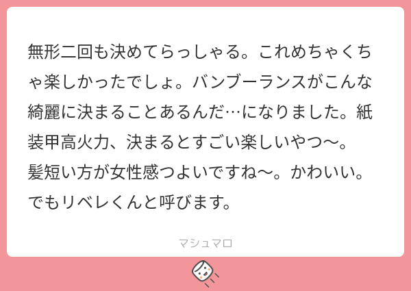 コメントありがとうございます。そりゃもう<rainbow>めっちゃ気分よくってエ……</rainbow>。特に1試合目の方は武器隠蔽だったので完全に勘で竹槍を持って行ったんですが、白熱した試合になり喜んでいます。