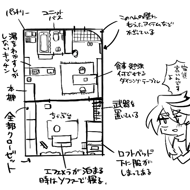 記録でちょろっと描いたときにどんな家か想像してみたものなんですが、多分こんな感じ。武器も衣装も基本家に置いていて、店長から借りている魔法のカバンで取り出している、という設定があったような気もしたんですが、持ち歩いた方が面白い場面では普通に大荷物を持たせている。